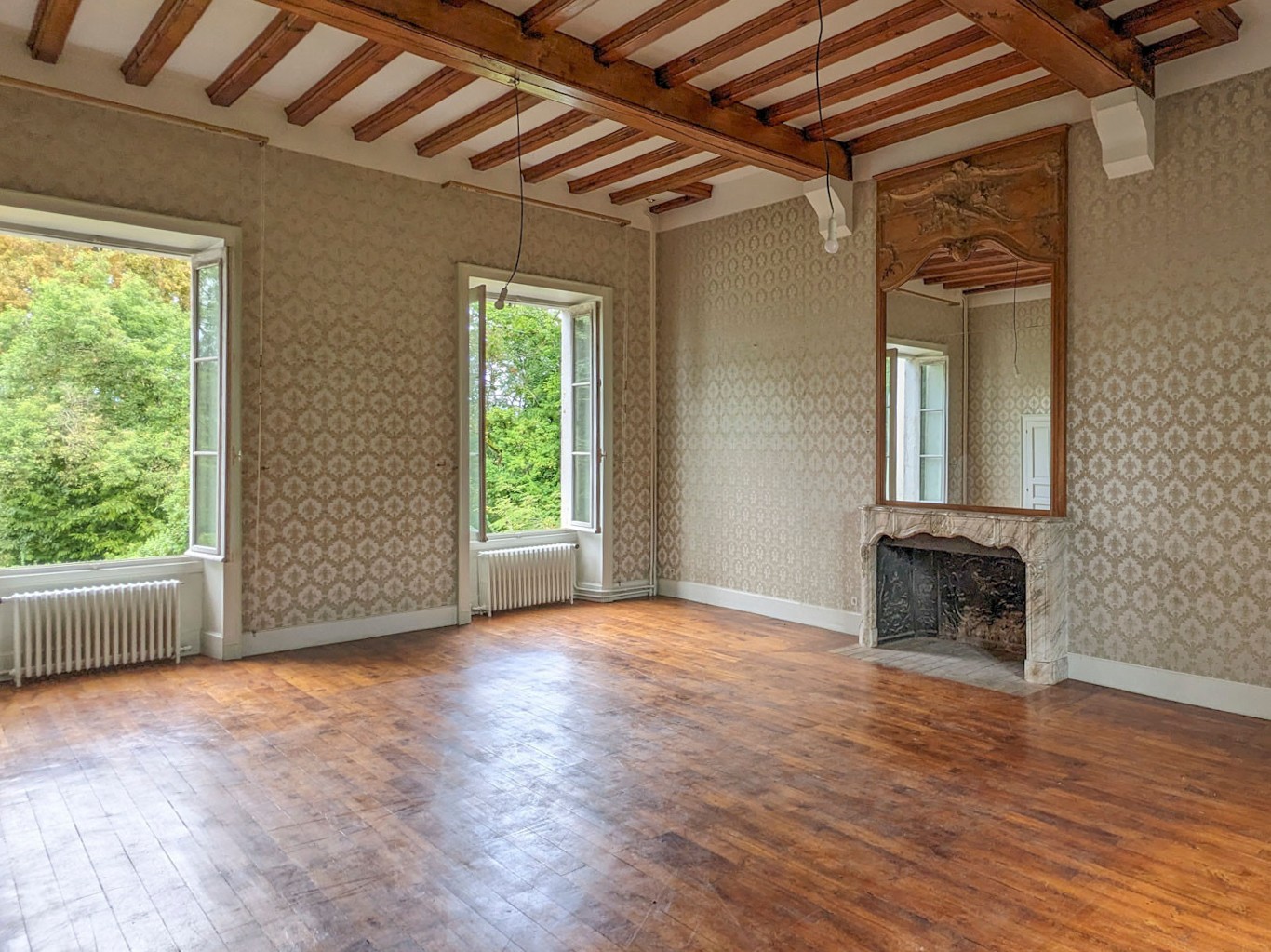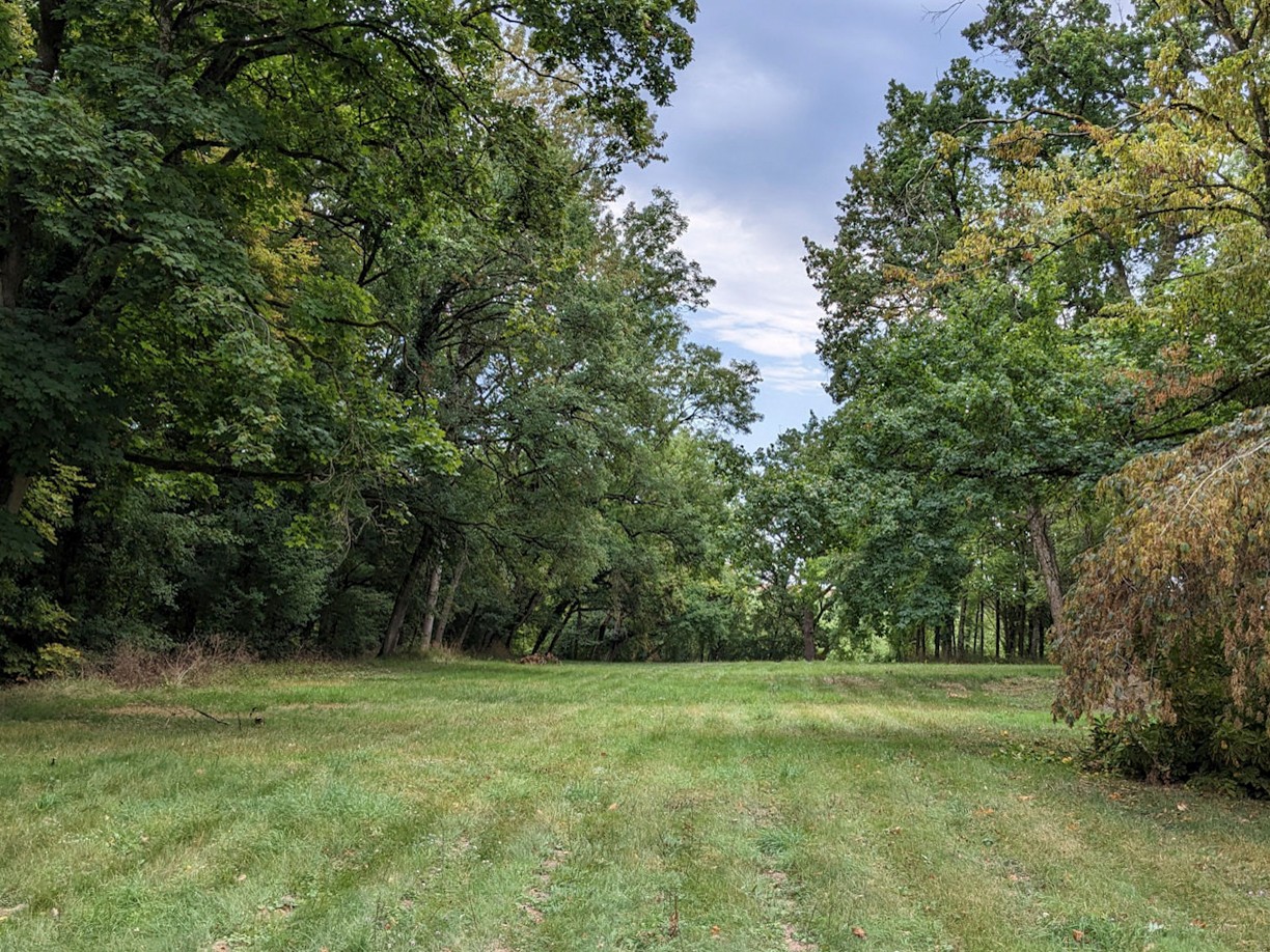 Het 3 hectare grote park is omgeven door een prachtig bos met oude bomen en een fontein, uitnodigend voor schaduwrijke wandelingen langs de rivier.