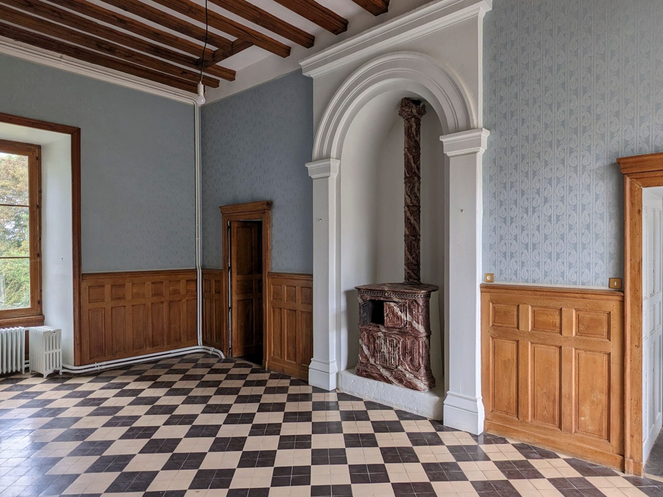 Op de eerste verdieping bevindt zich een rode kamer met een marmeren open haard en een schouw. Een badkamer in de toren aan de binnenplaatszijde, evenals een groene kamer met een kleine salon in de toren aan de parkzijde. Op de gang is er een kleedkamer. Daarnaast is er een groene kamer aan de binnenplaatszijde en een kamer met marmeren open haard met zuilen aan de parkzijde. Een andere kamer heeft een marmeren open haard en een kleedkamer met wastafel in de toren. Een fraai ontworpen badkamer uit de jaren 70 met zwart-witte schaakbordtegels en pistachegroene kleur, evenals een apart toilet, completeren deze verdieping.