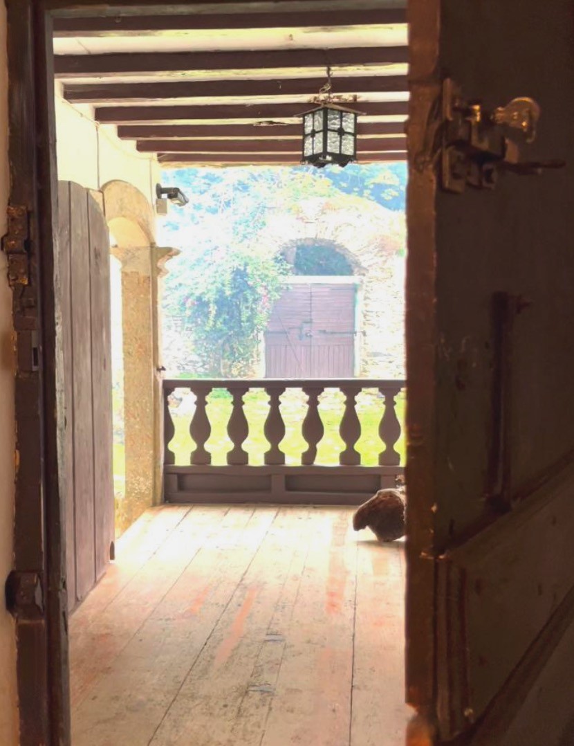 Desde la escalinata de piedra se accede a la entrada principal de la parte noble de la vivienda, presidida por un balcón con balaustrada de madera de marcado estilo barroco popular, que conduce a un amplio y luminoso salón con cinco grandes ventanales —dos de ellos con acceso directo a la solana.