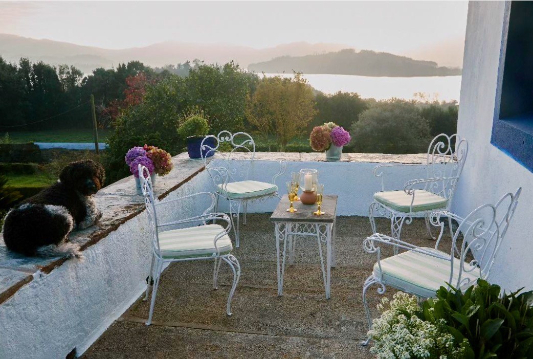 La solana, una amplia terraza que domina la fachada orientada a los jardines, con su sólida balaustrada de piedra y pavimento de grandes losas de granito, constituye un espacio excepcional para el descanso y el disfrute de las magníficas vistas sobre la Ría de Ortigueira.